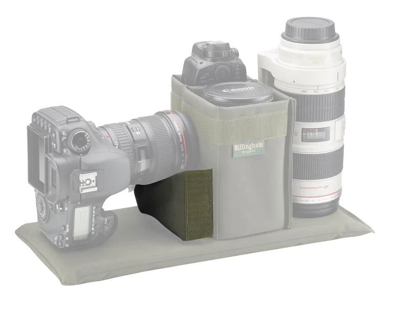 The '7 series' (107, 207, 307 & 307L camera bags) have a distinctive rectangular opening feature, comprising of two specially shaped fibreglass and aluminium wands that hold the zipped, main compartment open. This is known as the 'Billingham Press Top' feature and is a similar style to a doctors 'Gladstone' bag. The hinge between the wands either side is made of fabric to prevent users experiencing a mechanical failure and provide an easy and quicker opening than a typical doctors bag.