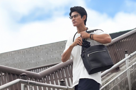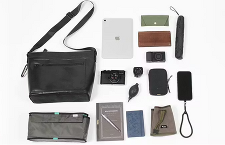 A camera bag with a perfectly balanced 50/50 relationship. Space for the camera is kept to just what is necessary. In exchange, the remaining space can be used freely to fit the user’s lifestyle. Carry a camera and draw the scenery in a sketchbook; take digital photos and immediately transfer them to an iPad or PC for editing; or take film photos while jotting down the location’s characteristics in a notebook. We defined that besides the camera, other items are necessary to “use” those photos. That is why the camera space is only half. The other half is for whatever else you need—handy fans, mobile batteries, AC adapters, and more.