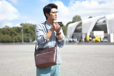 A camera bag with a perfectly balanced 50/50 relationship. Space for the camera is kept to just what is necessary. In exchange, the remaining space can be used freely to fit the user’s lifestyle. Carry a camera and draw the scenery in a sketchbook; take digital photos and immediately transfer them to an iPad or PC for editing; or take film photos while jotting down the location’s characteristics in a notebook. We defined that besides the camera, other items are necessary to “use” those photos. That is why the camera space is only half. The other half is for whatever else you need—handy fans, mobile batteries, AC adapters, and more.
