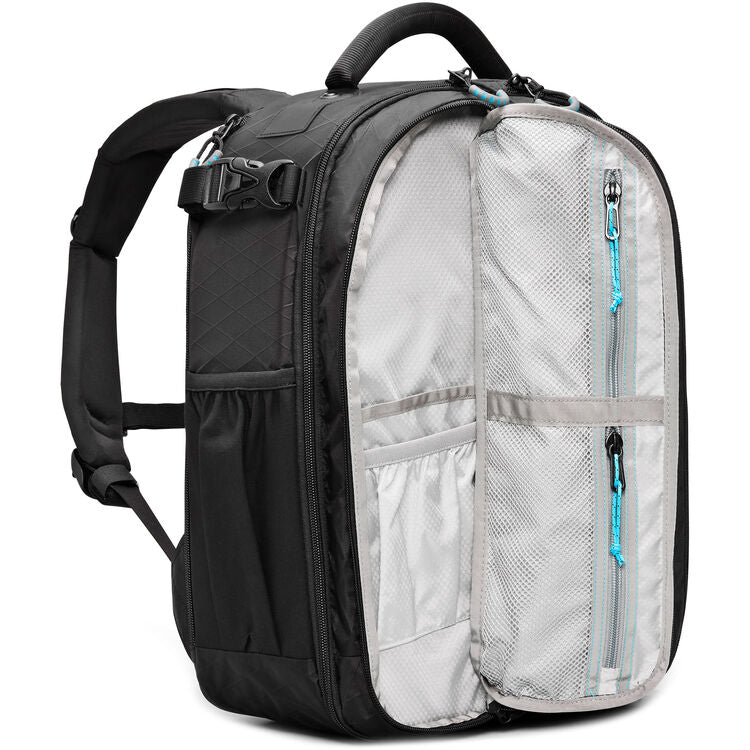 Two side-by-side, front-facing zippered panels fold open toward the center of the pack and provide individual access to the camera compartments. A zippered mesh organizer pocket on each panel's interior stores portable batteries, camera filters, or small electronics within the camera compartments. Each panel also features an outer flap that can be unzipped and opened toward the center of the backpack, even when the panels remain closed, revealing two additional organizer pockets for items that need be accessed quickly and conveniently without exposing the contents of the camera compartments.