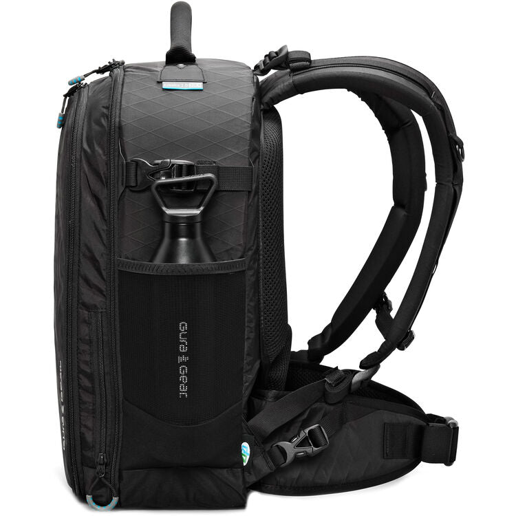 Carry options include a built-in top handle and padded, adjustable shoulder straps. The resilient and breathable 3D mesh padding along the rear exterior cushions your back and shoulders. The padding features an elevated structure to optimize air circulation, minimizing perspiration in warm and hot environments. For heavy loads, use the adjustable sternum strap and waist belt to evenly distribute the weight. The pack features a compartment for a 15" laptop or tablet and two large, stretch side pockets with compression straps for water bottles, a tripod, a monopod, or a trekking pole.