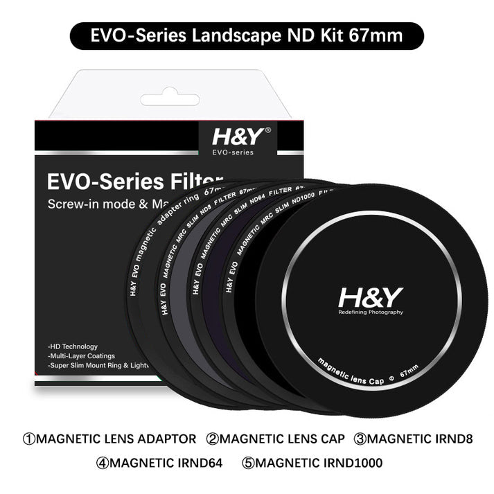 The H&Y HD EVO-Series Magnetic Landscape ND Kit is designed for landscape photographers needing extensive light control for stunning long-exposure shots. This comprehensive kit includes magnetic IRND8, IRND64, and IRND1000 filters, along with a base adaptor and lens cap, offering essential tools for exceptional landscape photography.