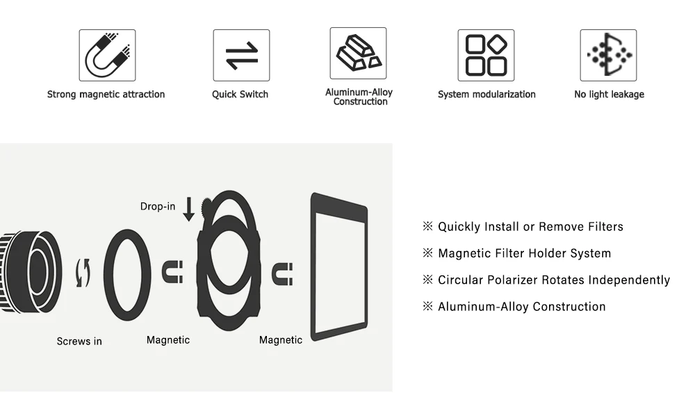 The square filter can be removed and detached using magnetic. Filters that require a rotary frame such as CPL filters are drop-in, and the effects can be adjusted via dial on the filter frame. Easy to put on and take off with you in the dark, cold-weather gloves and take them off at the shortest possible cost. Provides unprecedented comfort of filtering work