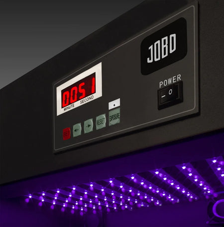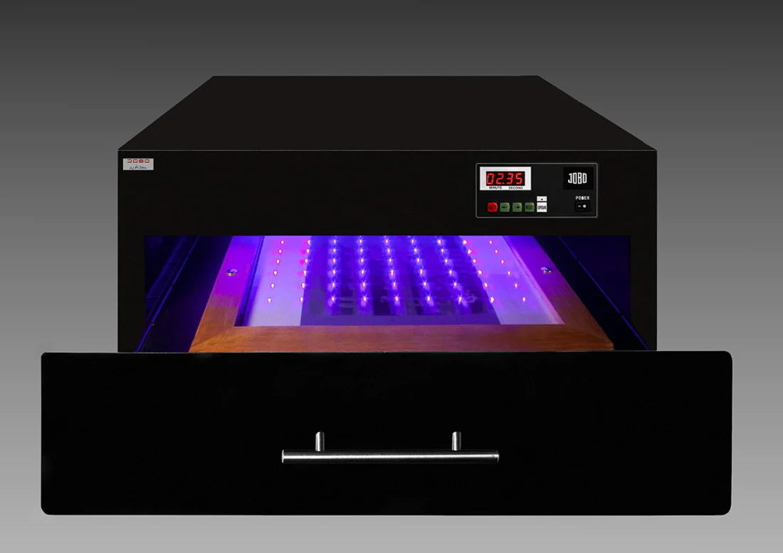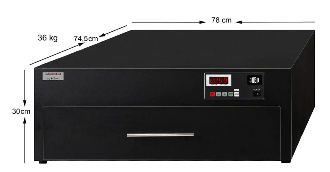 The JOBO artisan PLATINUM UV printer II is large enough to accommodate contact frames with an external dimension of up to 65 x 86 cm so that 50x60 cm prints can easily be created. Its drawer is guided on ball bearings to enable easy loading and unloading. The integrated timer allows for exact exposures. The uniform UV exposure is generated by 110 LEDs from 360 to 390 nm. In contrast to fluorescent tubes, LEDs consume 80% less electricity and, more importantly, do not require a warm-up phase to reach a complete and consistent luminosity. LEDs are herewith unsurpassed in generating consistently reliable exposure times.