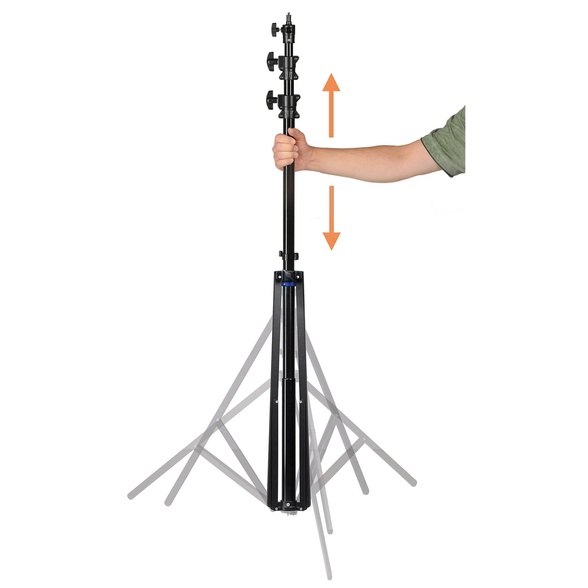 With clever tripod leg folding mechanism for quick change of position: Lifting the light stand will make the legs fold towards the centre column, now touching the center column to the ground will cause the legs to move apart automatically.
